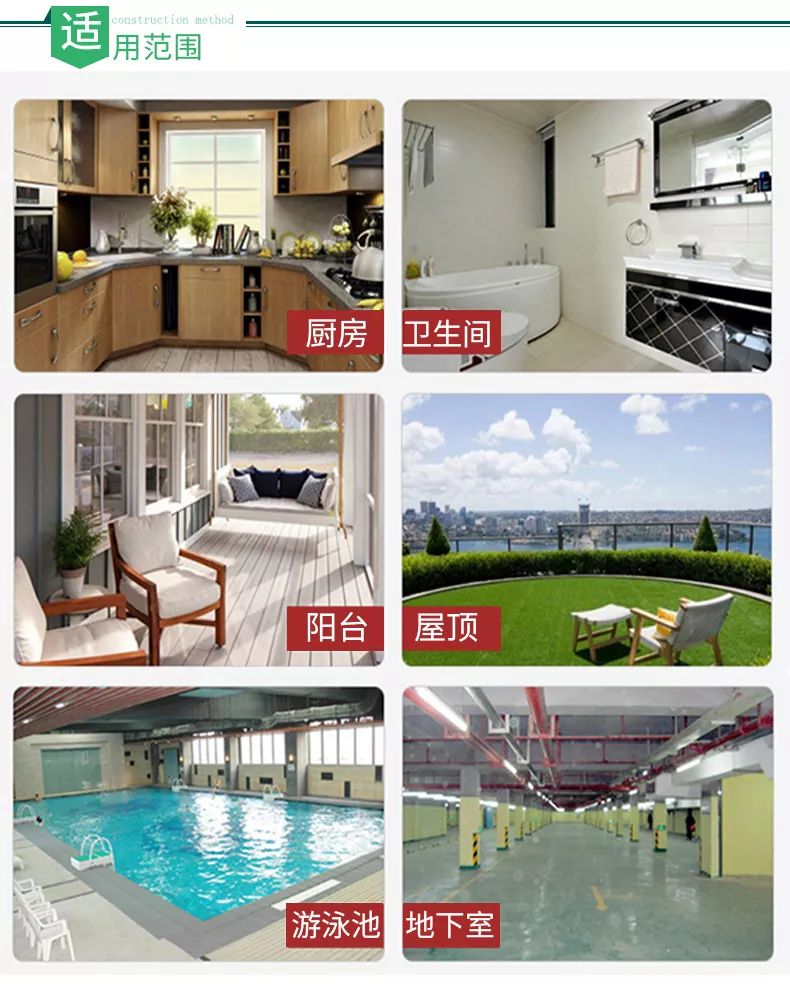 产品特点: 1、施工性好,超高强度,耐磨性好; 2、优异的耐水性,潮湿区域可直接施工; 3、可使用在室外,具有良好耐候性; 4、特别适用于墙角,管道周边等易渗水部分; 5、粘接力强,具有迎水面和背水面的防水功能。 6、无毒无害,无环境污染;